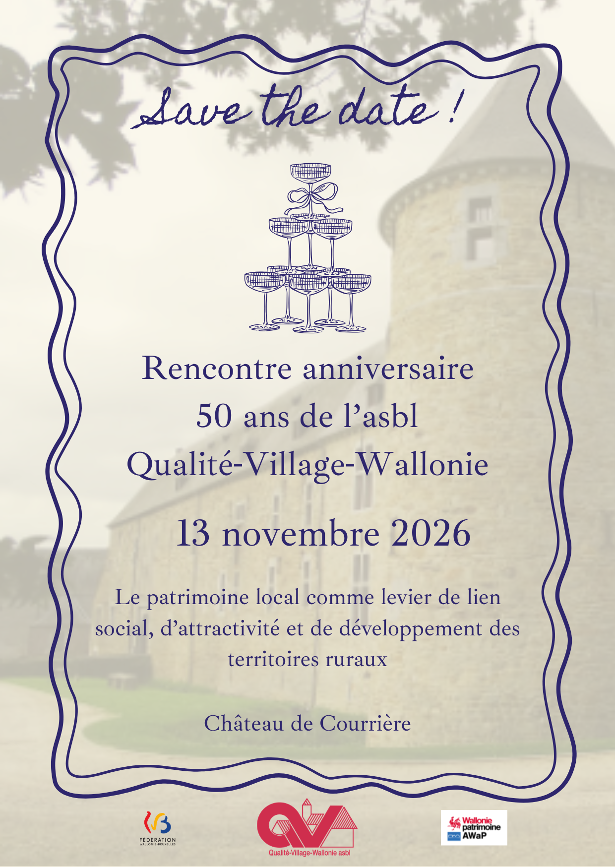 L'asbl Qualité-Village-Wallonie a le plaisir de vous convier à sa Rencontre anniversaire, qui se déroulera le vendredi 13 novembre prochain au château de Courrière.